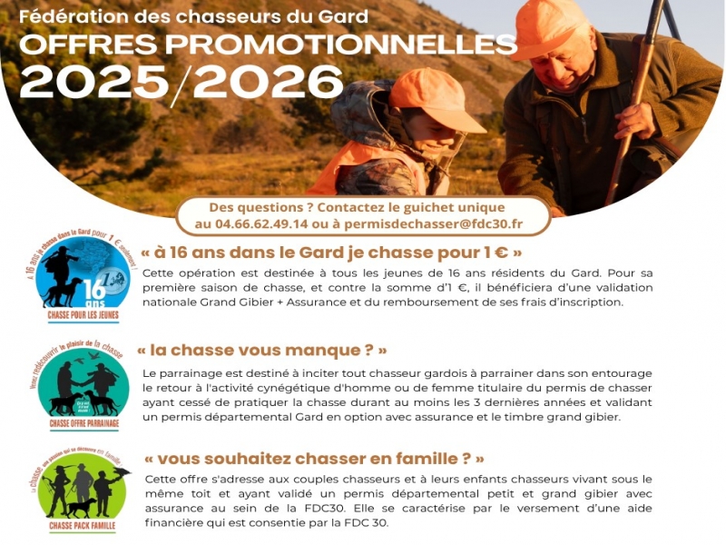 - A 16 ANS, JE CHASSE POUR 1€: Cette opération est destinée à tous les jeunes de 16 ans, résidents du Gard. Contre 1€ symbolique et une autorisation parentale, le jeune chasseur ou chasseresse, bénéficiera d'un permis national toutes espèces pour sa première saison de chasse.