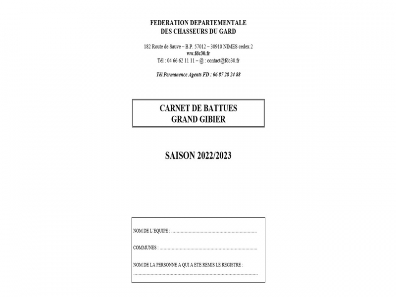 La Fédération Départementale des Chasseurs du Gard invite les sociétés de chasse à retourner leurs carnets de battues entre le 1er et le 15 avril 2023 soit en se présentant à l’accueil pou...