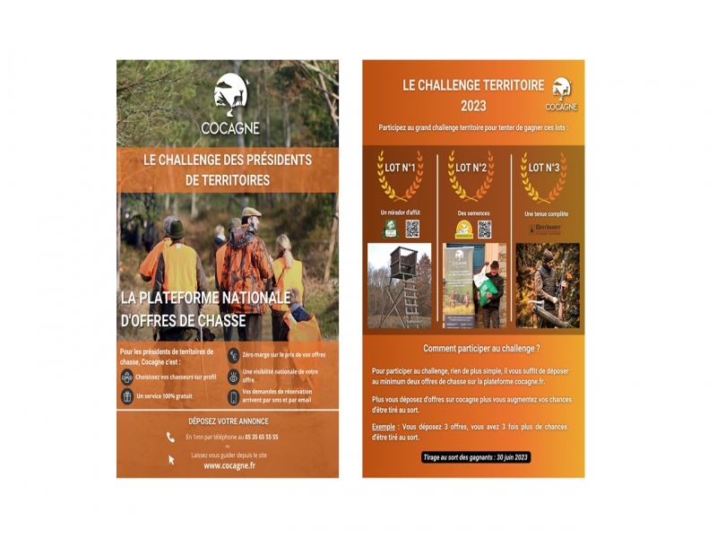 Participez au grand challenge territoire pour tente de gagner ces lots : Lot N°1 : un mirador d'affût Astrid de Sologne Lot N°2 : des semences du Territoire 77 Lot N°3 : Une tenue complète de la marque Deerhunter Com...