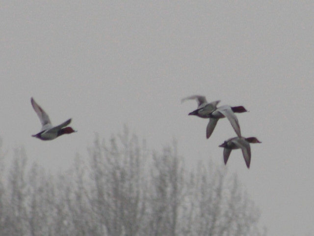 En vol, la silhouette des Fuligules milouins paraît ramassée, les ailes grises sont éclaircies par une bande pâle. Les milouins forment des groupes compacts et homogènes.