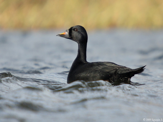 Macreuse noire, Melanitta nigra (Linné, 1758) Classification (Ordre, Famille) : Ansériformes, Anatidés Description de l’espèce Le mâle a un plumage entièrement noir brillant, à l’excepti...